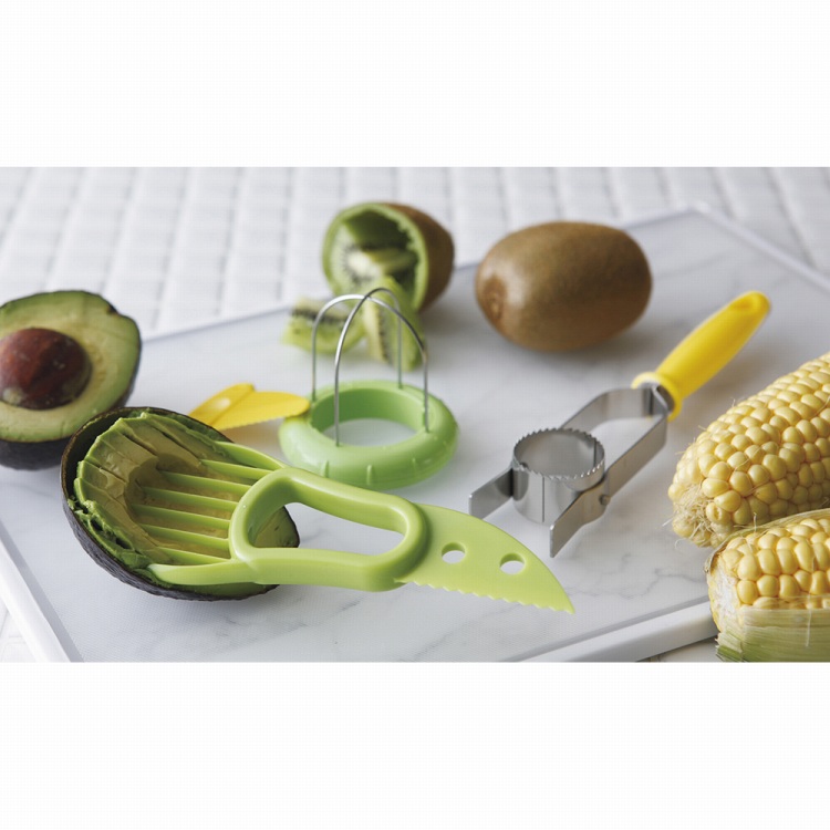 キウイとアボカド、とうもろこしを専用の道具でカットできます。