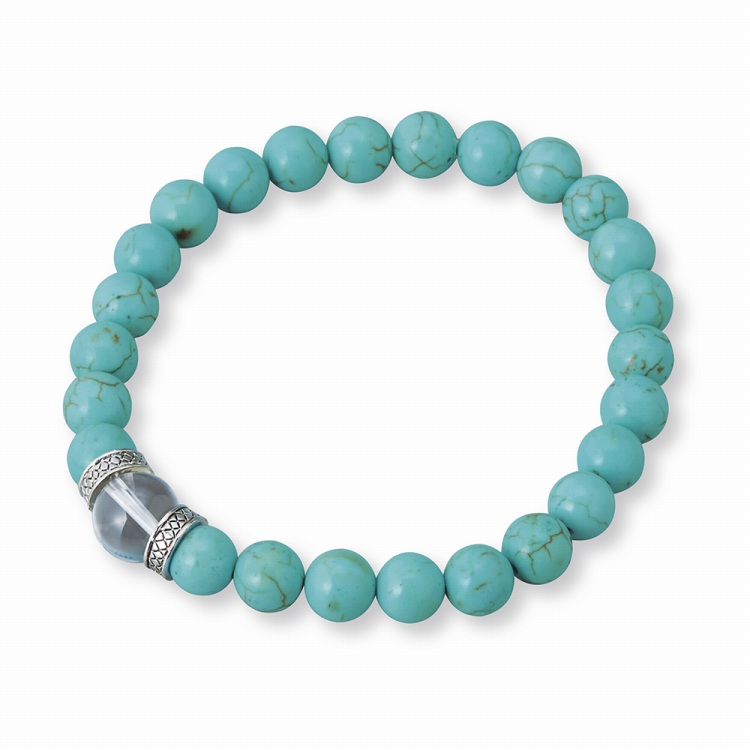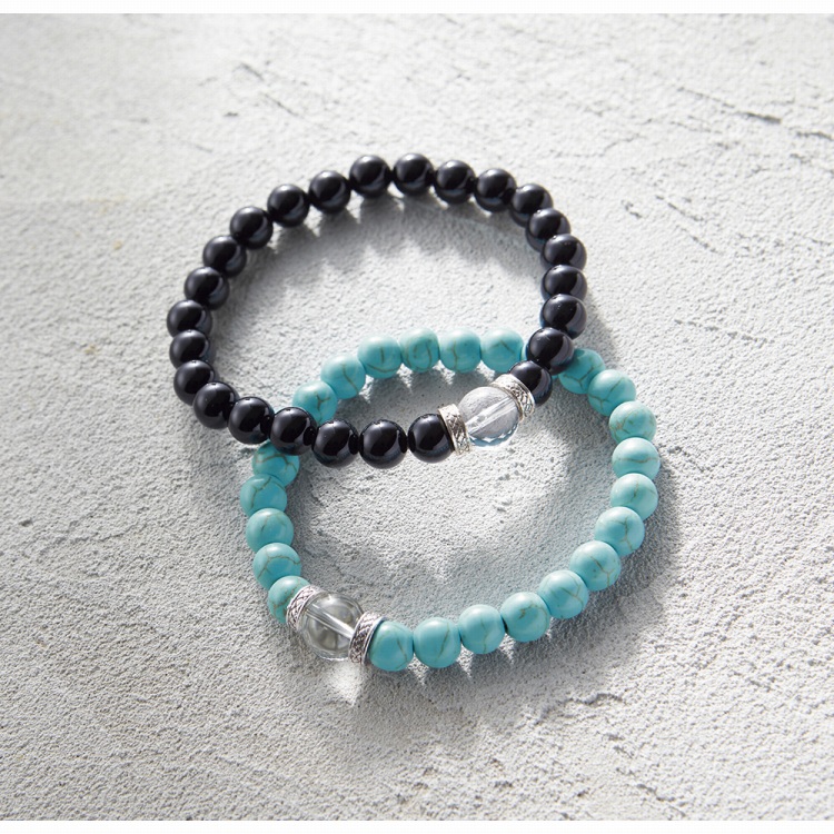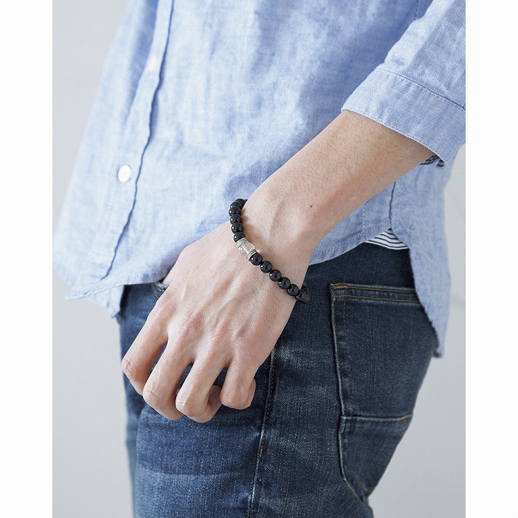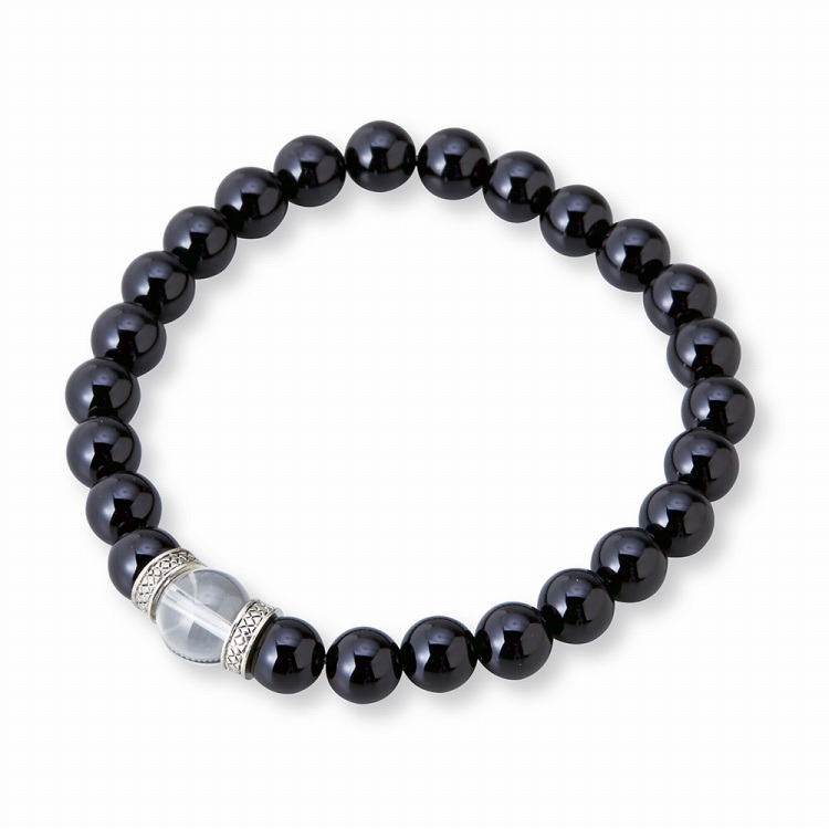 ●材質:ブラック/オニキス25石・水晶1石・亜鉛合金(ロジウムメッキ・墨入れ加工)・伸縮ゴム、ブルー/ターコイズ25石・水晶1石・亜鉛合金(ロジウムメッキ・墨入れ加工)・伸縮ゴム