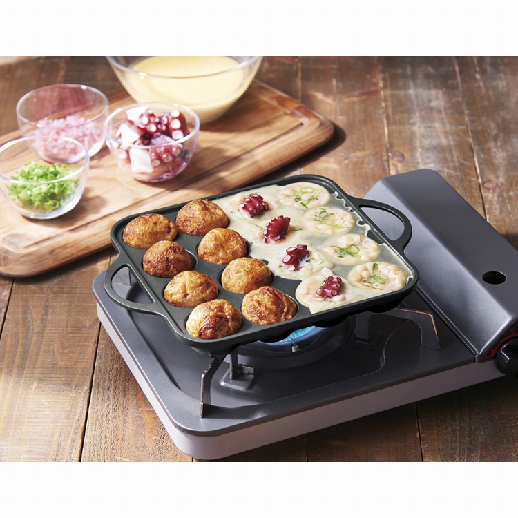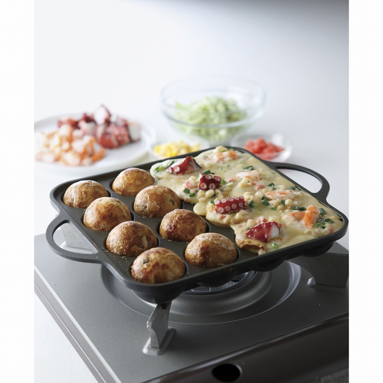 たこ焼きが返しやすく焦げ付きにくいフッ素樹脂加工が施されたガス火専用のたこ焼き器。