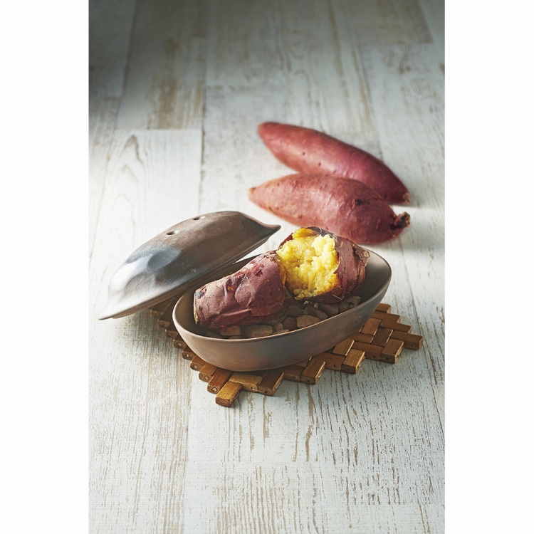 陶製の本体に付属の石を敷き詰めて、電子レンジで簡単に石焼いもができます。