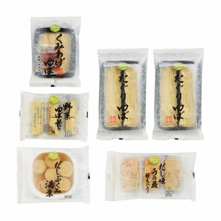 商品内容●セット内容:たぐりゆば70g×2、だしふくみ湯葉130g・くみあげゆば90g(ゆば70g、つゆ20g)・野菜ゆば巻き102g・だし味うの花桜えび入り135g各1