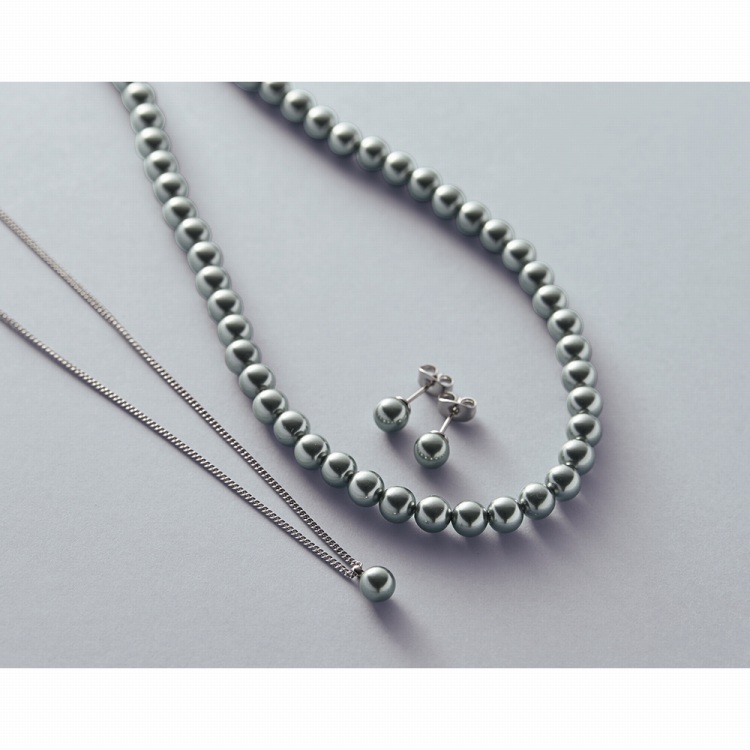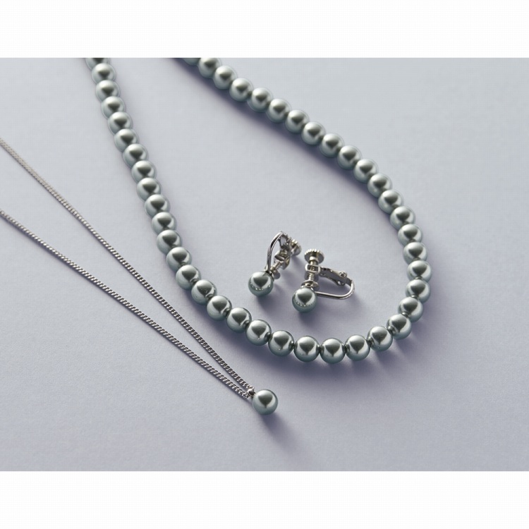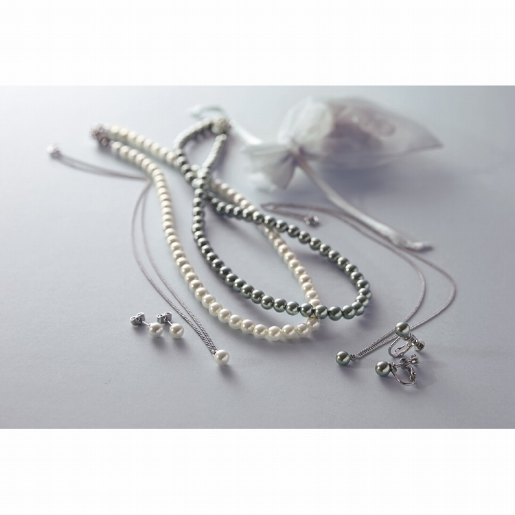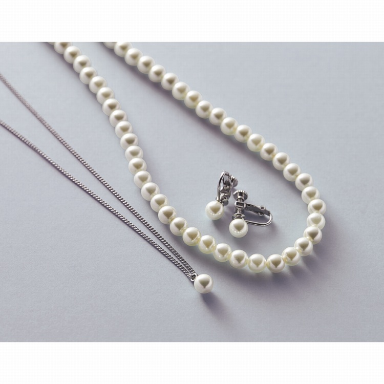 ●材質:ネックレス・ペンダント・イヤリング/人工貝パール(約径6mm)・真鍮(ロジウムメッキ)、ピアス/(本体)人工貝パール(約径6mm)・(ポスト)サージカルステンレス・(キャッチ)真鍮(ロジウムメッキ)