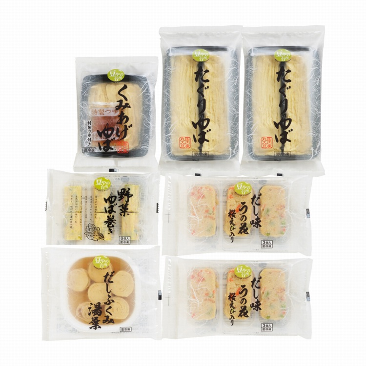 商品内容●セット内容:たぐりゆば70g・だし味うの花桜えび入り135g各2、だしふくみ湯葉130g・くみあげゆば90g(ゆば70g、つゆ20g)・野菜ゆば巻き102g各1