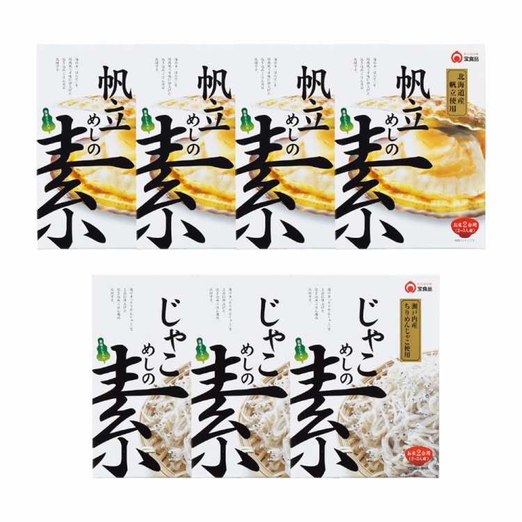 商品内容●セット内容:帆立めしの素230g(2合用)×4、じゃこめしの素230g(2合用)×3