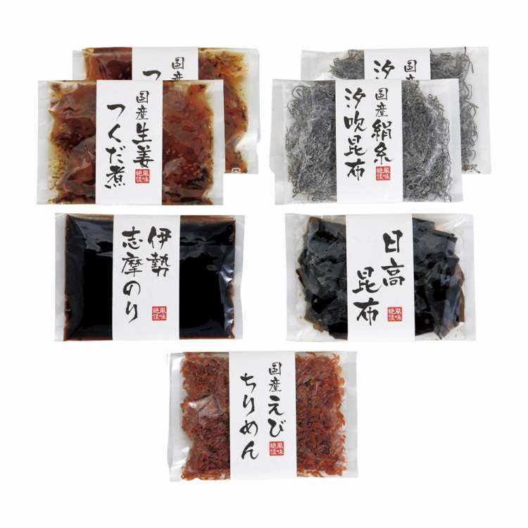 商品内容●セット内容:生姜つくだ煮50g・絹糸汐吹昆布20g各2、伊勢志摩のり100g・日高昆布50g・えびちりめん30g各1