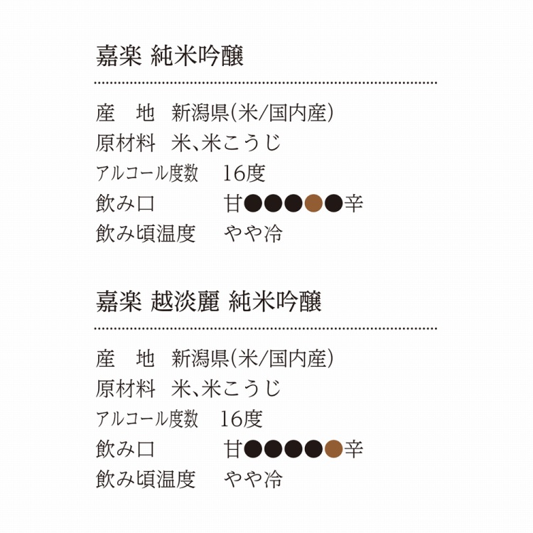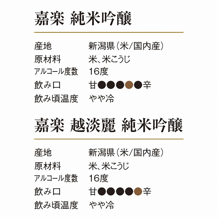商品内容●嘉楽 純米吟醸720ml、嘉楽 越淡麗 純米吟醸720ml