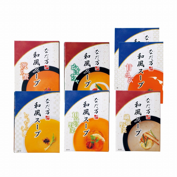 商品内容●セット内容:和風スープ(甘えび130g×2、とうもろこし130g・繊維野菜130g・10種の野菜130g・かぼちゃ130g・渡り蟹130g各1)