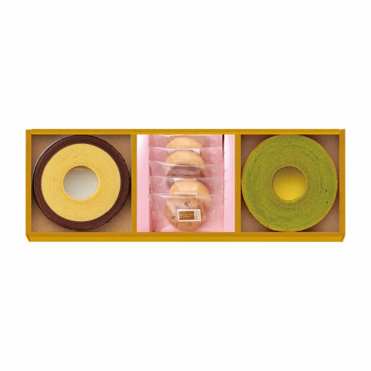 商品内容●セット内容:バームクーヘン直径約13cm(宇治抹茶・チョコ&バナナ各1)、クッキー(プレーン×3、プレーン&チョコチップ・チョコ&チョコチップ各1)