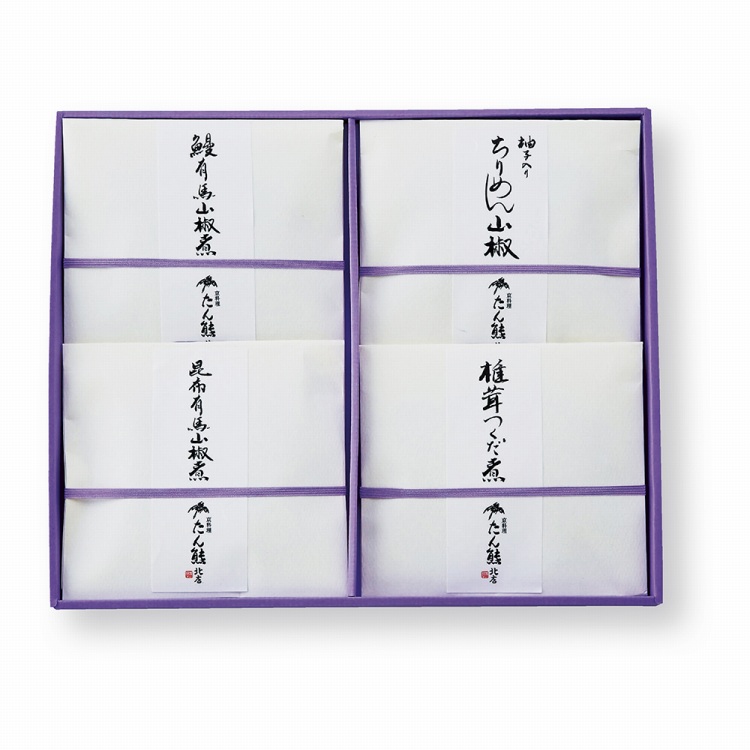 商品内容●セット内容:鰻有馬山椒煮60g・柚子入ちりめん山椒50g・昆布有馬山椒煮70g・椎茸つくだ煮80g各1
