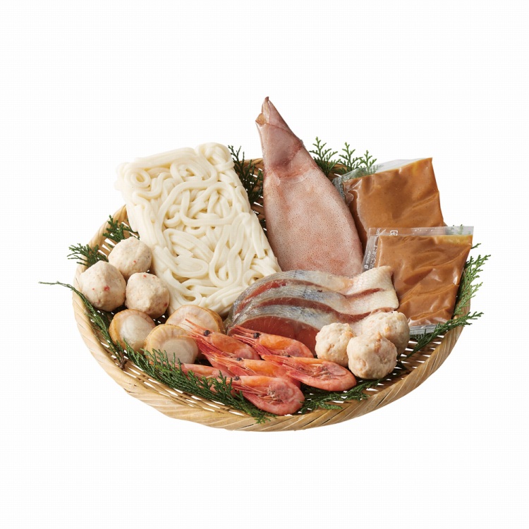 商品内容●セット内容:秋鮭切身40g×3、ボイル甘えび×6、ボイル帆立×3、つみれ(かに入・えび入各3)、ツボ抜するめいか100g・うどん250g各1、たれ付