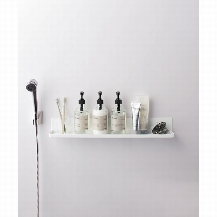 マグネットで浴室壁面にシャンプーや石けんを収納。