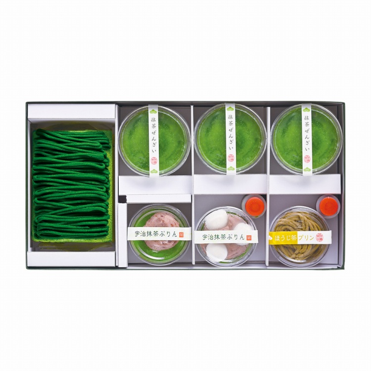 商品内容●セット内容:宇治抹茶モンブランロールケーキ・宇治抹茶白玉プリン115g・宇治抹茶プリン95g・宇治ほうじ茶プリン95g各1、宇治抹茶ぜんざい125g×3、宇治抹茶みつ・黒みつ付