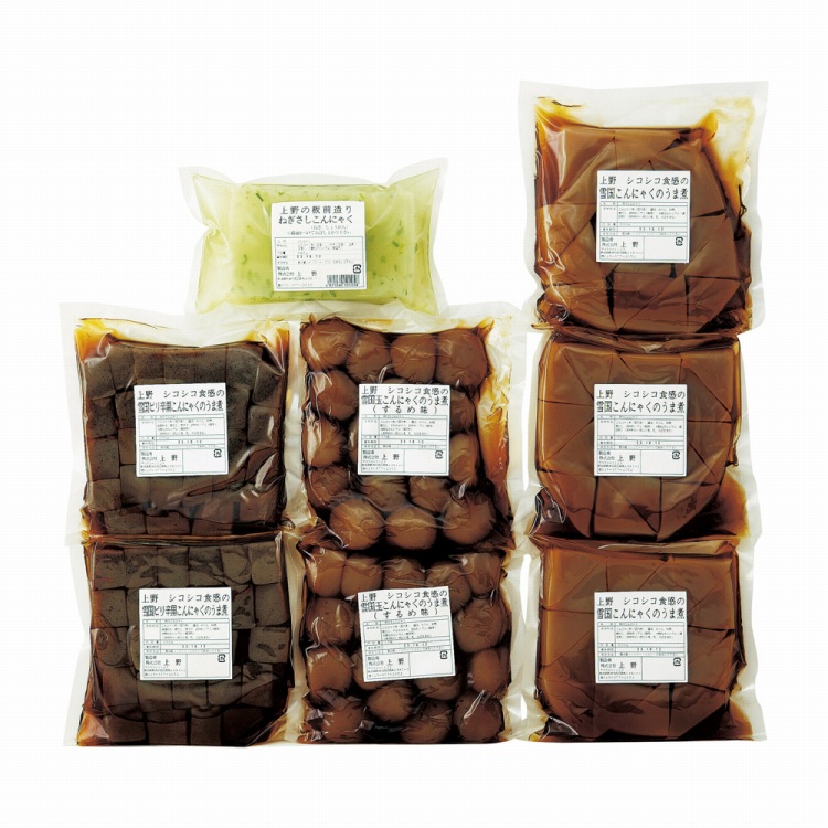 商品内容●セット内容:こんにゃくのうま煮500g×3、ピリ辛黒こんにゃくのうま煮490g・玉こんにゃくのうま煮17個入各2、ねぎさしこんにゃくブロック280g×1