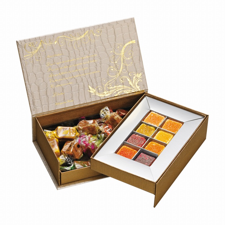 「品質」「製法」「原材料」にこだわった伝統のお菓子【パート・ドゥ・フリュイ8粒】と【キャラメル16粒】を上下2層のスライド式パッケージにセット。