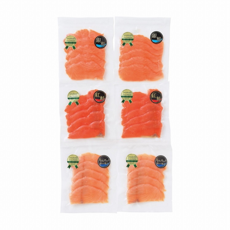 商品内容●セット内容:銀鮭スモークスライス50g・紅鮭スモークスライス50g・アトランティックサーモンスモークスライス50g各2