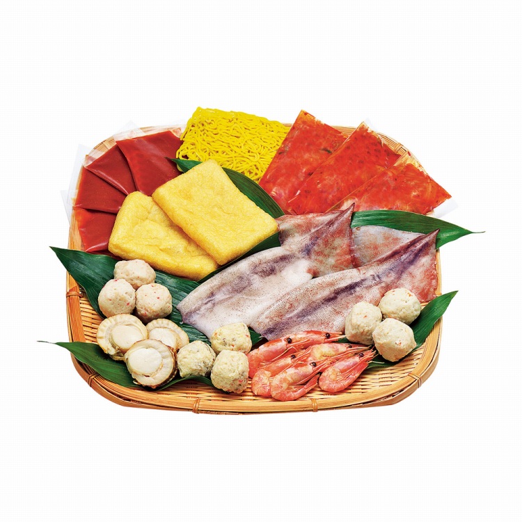 商品内容●セット内容:ボイル甘えび×6、ボイル帆立×3、ツボ抜するめいか・油揚げ各2、ラーメン80g×1、つみれ(かに入・えび入・とりごぼう各3)、白菜キムチ(韓国産)300g、たれ付