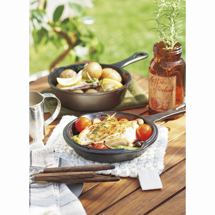 商品内容●商品:スキレット大(約径15〈持ち手含む長さ25.8〉×高さ4.5cm・重量約880g)・小(約径14〈持ち手含む長さ25.5〉×高さ3.3cm・重量約850g)・敷板(約18×18×厚さ1.5cm)各1