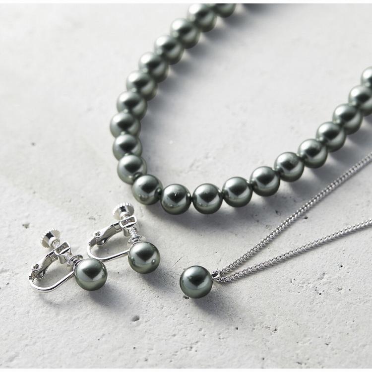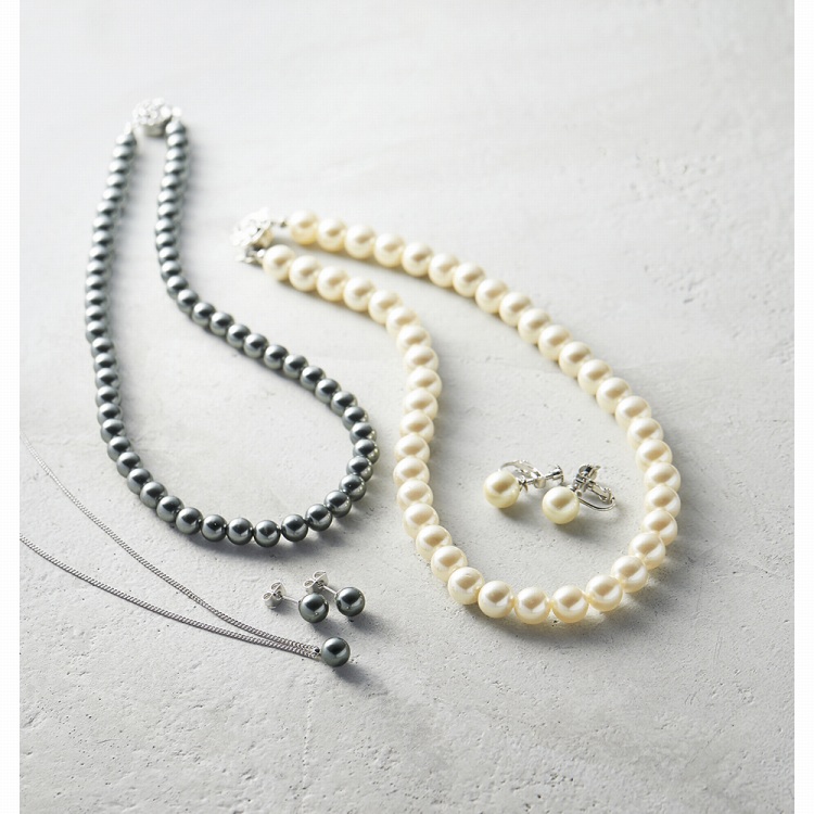 ●材質:ネックレス・ペンダント・イヤリング/人工貝パール(約径7mm)・真鍮(ロジウムメッキ)、ピアス/(本体)人工貝パール(約径7mm)・(ポスト)サージカルステンレス・(キャッチ)真鍮(ロジウムメッキ)