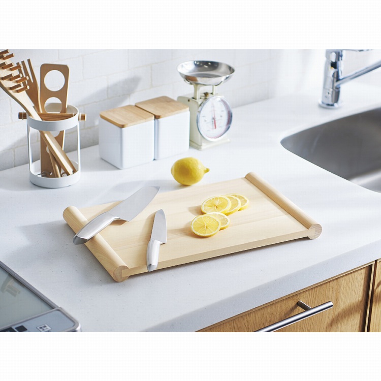 両サイドの丸棒でまな板を浮かせ、天板につかない仕様なので、水分の吸収が少なく使えます。