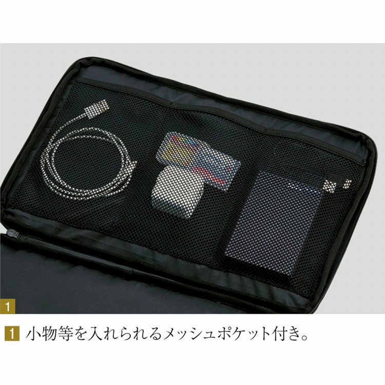 ●内容:内部/テープ式ポケット×1・メッシュオープンポケット×3、前面/ファスナーポケット×1、開閉部ファスナー式