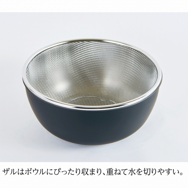 ザルはボウルにぴったり収まり、重ねて水を切りやすい。