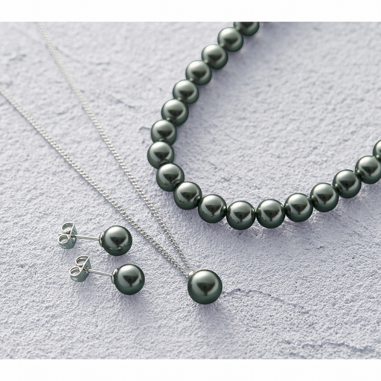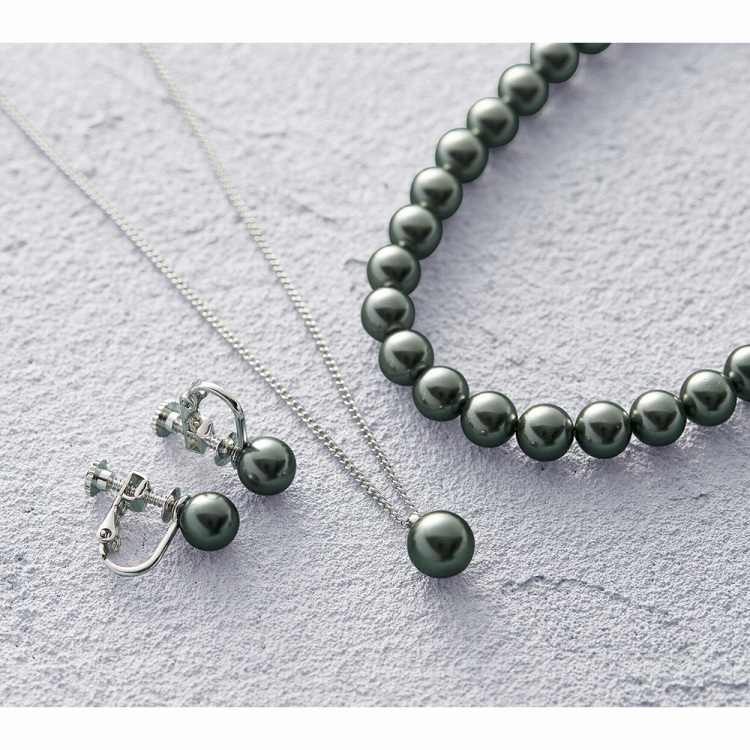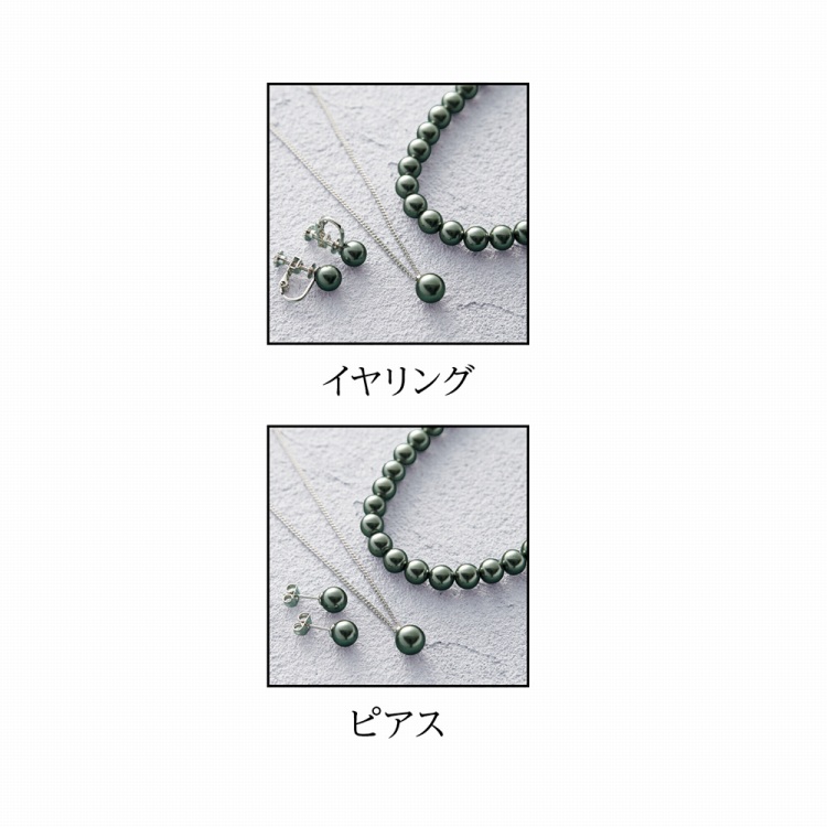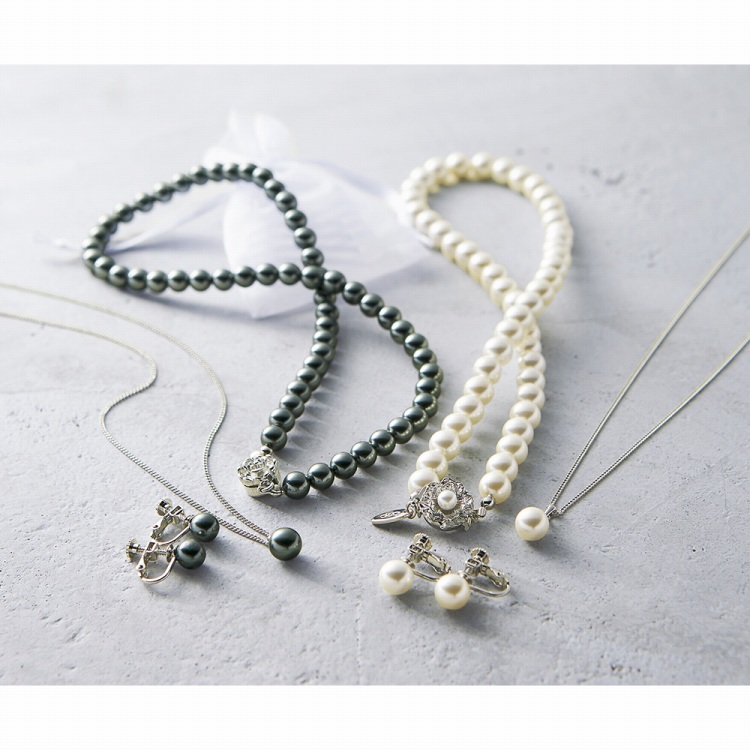 ●材質:ネックレス・イヤリング/人工貝パール(約径7mm)・真鍮(ロジウムメッキ)、ペンダント/人工貝パール(約径8mm)・真鍮(ロジウムメッキ)、ピアス/(本体)人工貝パール(約径7mm)・(ポスト)サージカルステンレス・(キャッチ)真鍮(ロジウムメッキ)