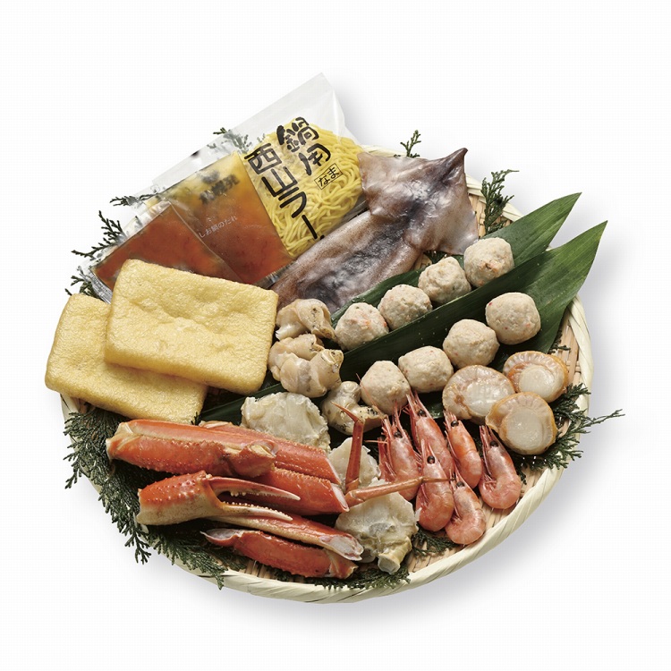 商品内容●セット内容:ボイルズワイガニカット300g・ツボ抜するめいか100g・ボイルつぶ貝60g・ラーメン80g各1、ボイル甘えび×6、ボイル帆立×3、油揚げ×2、つみれ(かに入・えび入各4)、たれ付