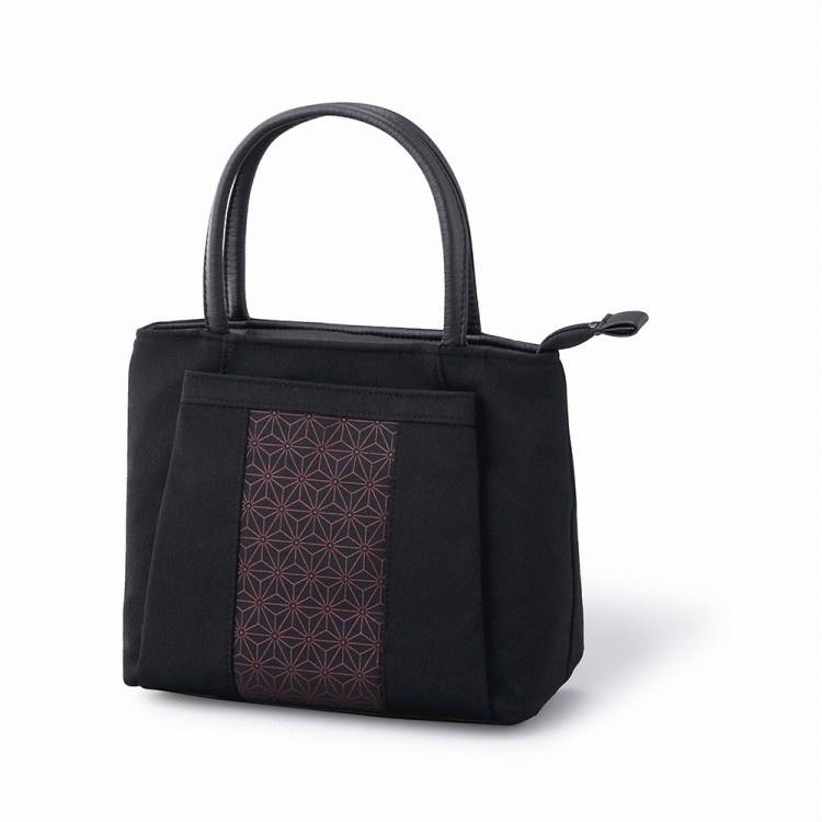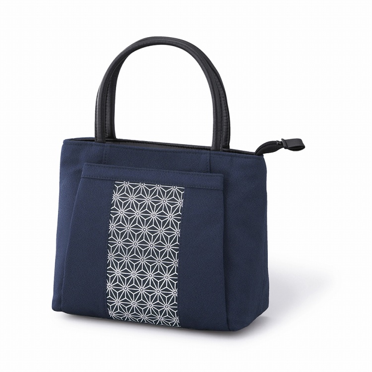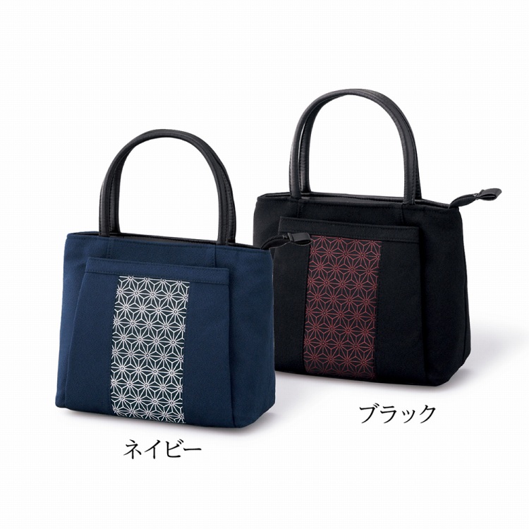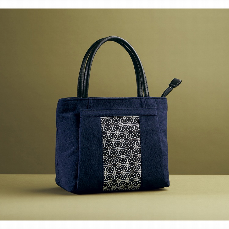 このバッグは、日本古来から愛される、麻の葉柄をポイントに使った、上品で使いやすい手提げバッグで、本体にはちりめん生地を使用しています。