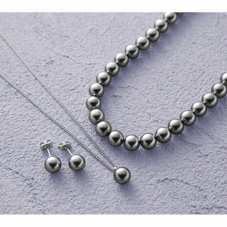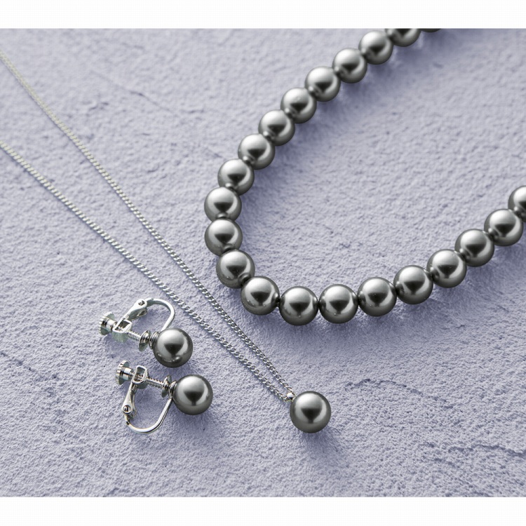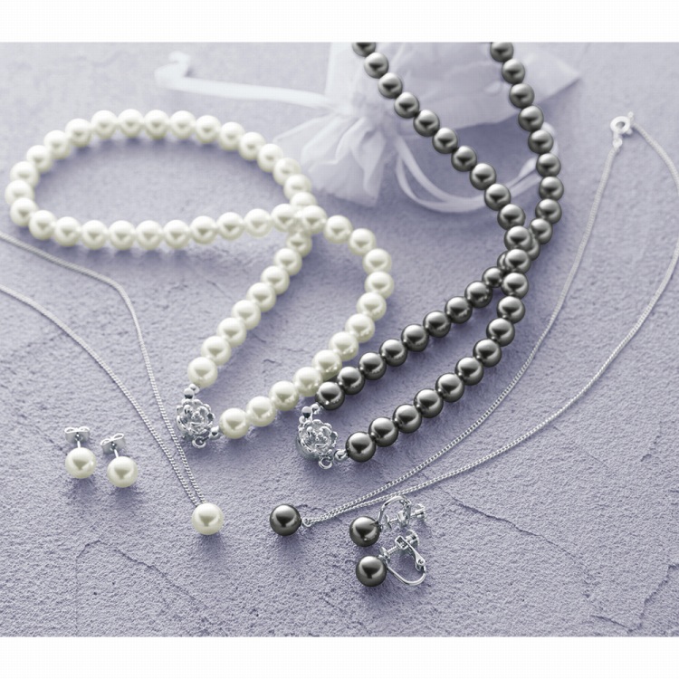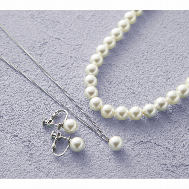 ●材質:ネックレス・ペンダント・イヤリング/人工貝パール(約径8mm)・真鍮(ロジウムメッキ)、ピアス/(本体)人工貝パール(約径8mm)・(ポスト)サージカルステンレス・(キャッチ)真鍮(ロジウムメッキ)