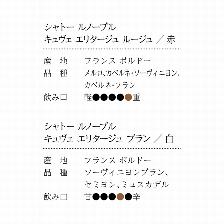 商品内容●シャトー ルノーブル キュヴェ エリタージュ ルージュ750ml、シャトー ルノーブル キュヴェ エリタージュ ブラン750ml、ソムリエナイフ付