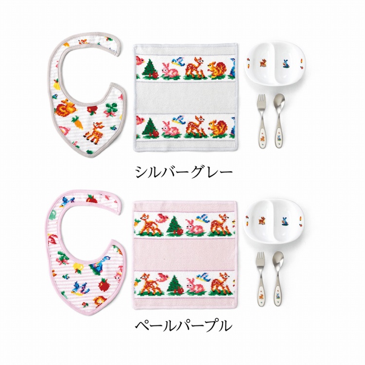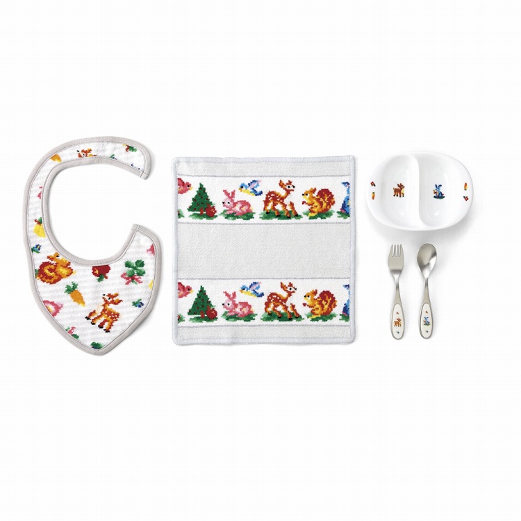 ●材質:スタイ/(本体)綿100%(シュニール織)・(フチ部分)綿100%、ハンカチ/綿100%(シュニール織)、ミニプレート/陶磁器、フォーク・スプーン/ステンレス・エポキシ樹脂