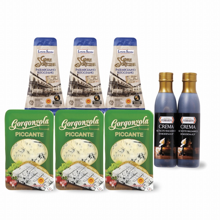 商品内容●セット内容:ゴルゴンゾーラピカンテ150g・パルミジャーノレジャーノ125g各3、クレマディバルサミコ250ml×2