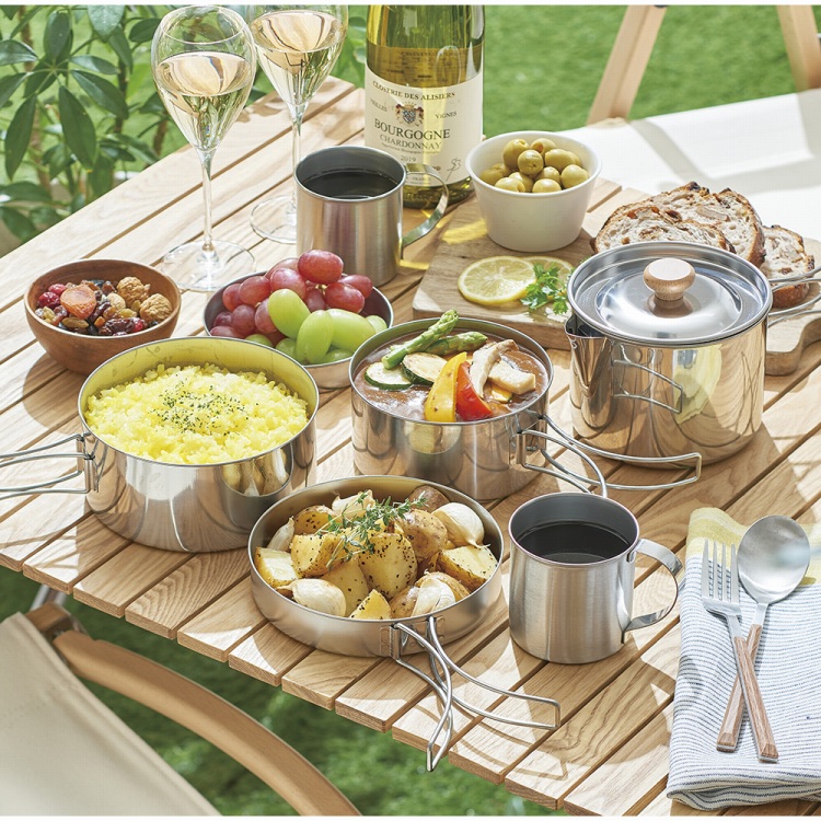 商品内容●商品:キャンピングケトル(約径12×高さ9.3cm・適正容量約600ml)・ソースパン(約径14×高さ7cm・1070ml)・ソースパンカバー(約径14.5×高さ1.6cm)・ミルクパン(約径12×高さ6.5cm・730ml)・ミルクパンカバー(約径12.7×高さ1.5cm)・ミルクパントレー(約径11.8×高さ2.6cm)・フライパン(約径14.5×高さ3cm)各1、マグカップ(約口径7.3×高さ7cm・300ml)×2