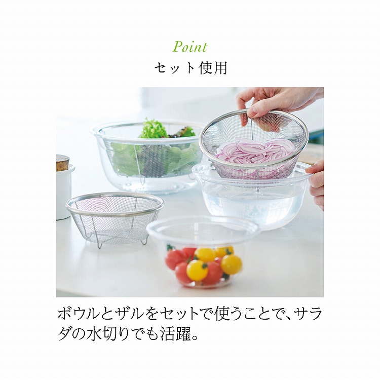 セット使用ボウルとザルをセットで使うことで、サラダの水切りでも活躍。