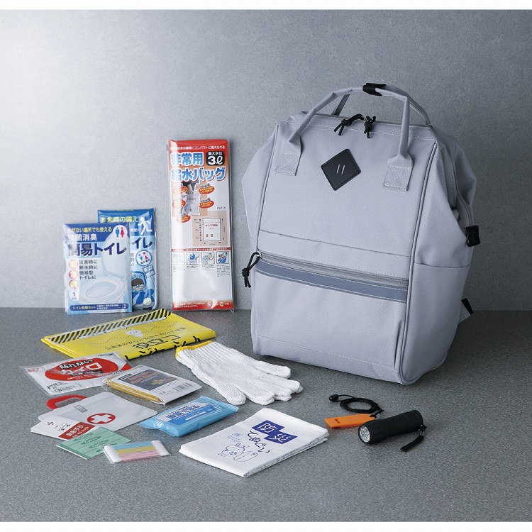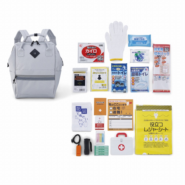 商品内容●商品:防災リュック(約29×19×高さ36cm)・防災の心得・ホイッスル・カイロ・レインコート・携帯用トイレ・抗菌消臭簡易トイレ・LEDライト(約径3.2×長さ9.8cm)・軍手・アルミブランケット(約140×220cm)・防災てぬぐい・レジャーシート(約60×90cm)・給水バッグ(約3L用)・緊急避難カード・除菌アルコールウェットティッシュ・水に流せるペーパー・救急4点セット(絆創膏・綿棒・救急の手引き・ジッパーバッグ)各1