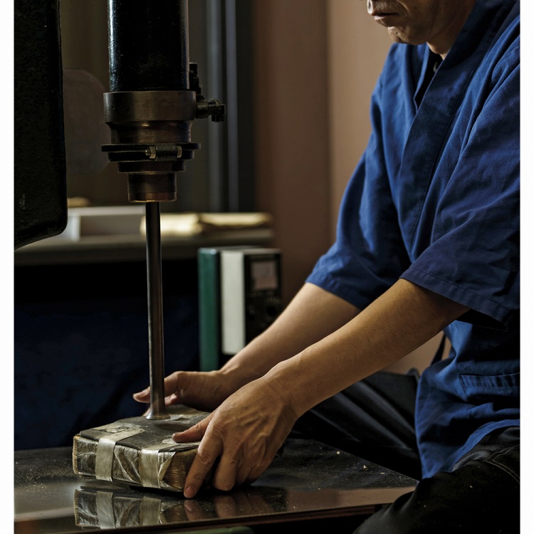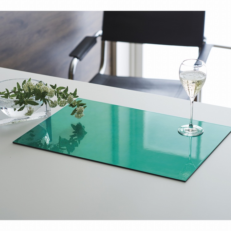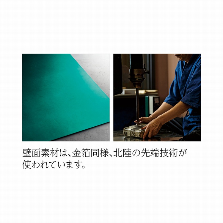 目の覚める様なカラーが美しいテーブルマットは、心象風景が思い描く青富士の青色。伝統工芸士が1万分の1ミリに打って延ばした錫の箔を一枚一枚丁寧に貼ることで仕上げられてます。水面のようにゆらめく表面は、錫の箔の上に透過性のある顔料を乗せることで箔の質感を残しているからこそ。金沢箔の伝統工芸職人による箔一独自の箔工芸技術を駆使した仕上げと、富山の高い工業技術から編み出された壁面素材が出逢い、生まれた北陸の伝統と先端技術のマリアージュをお愉しみください。