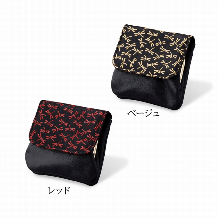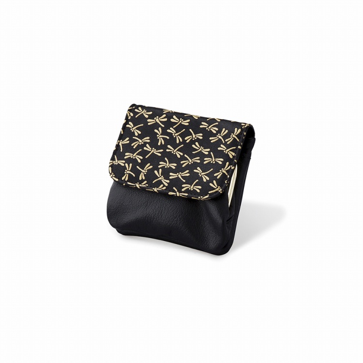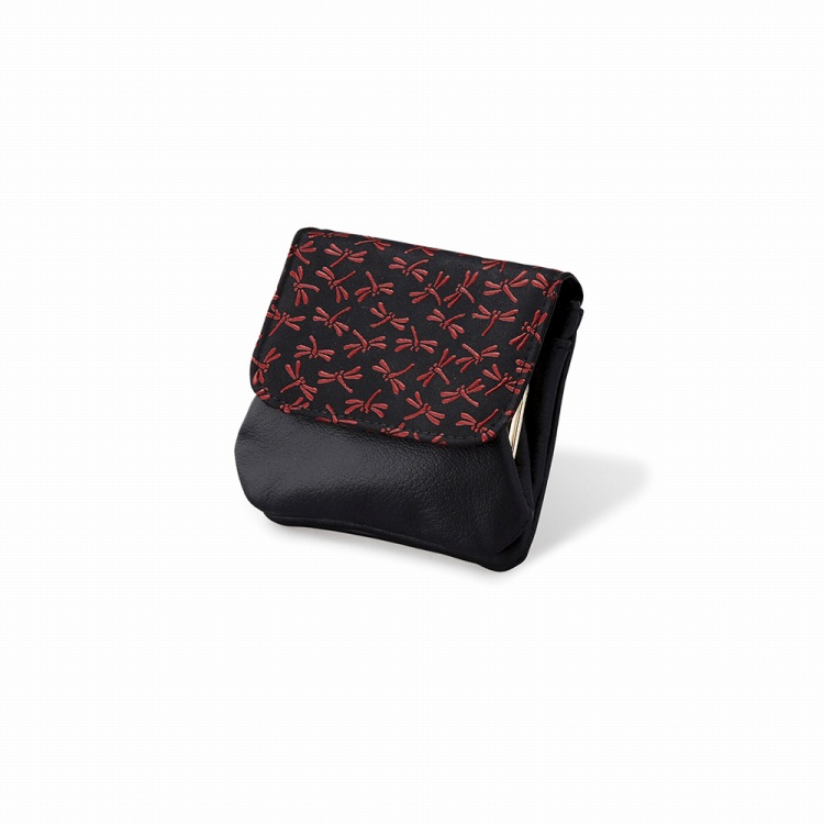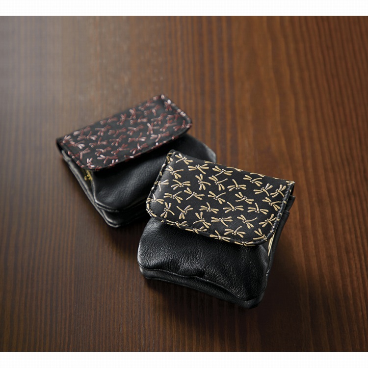 “勝ち虫”とも呼ばれ縁起が良いトンボを印伝で表現した使いやすいかぶせがま口財布です。