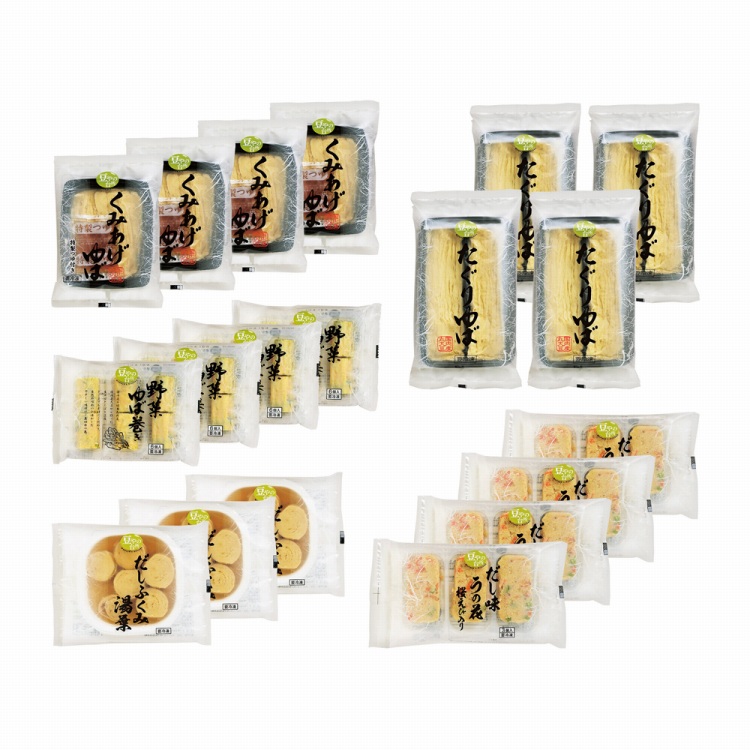 商品内容●セット内容:たぐりゆば70g・くみあげゆば90g(ゆば70g、つゆ20g)・野菜ゆば巻き102g・だし味うの花桜えび入り135g各4、だしふくみ湯葉130g×3