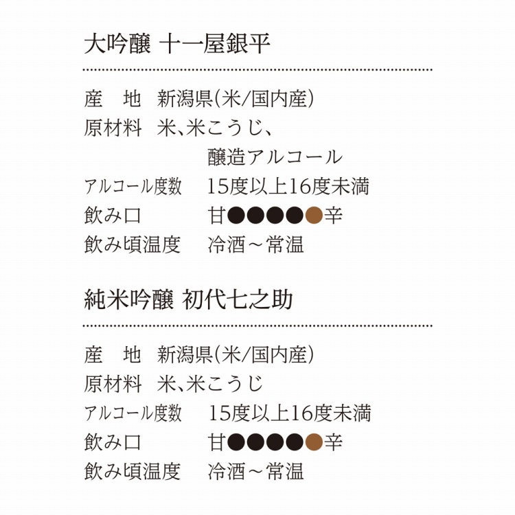 商品内容●大吟醸 十一屋銀平1.8L、純米吟醸 初代七之助1.8L