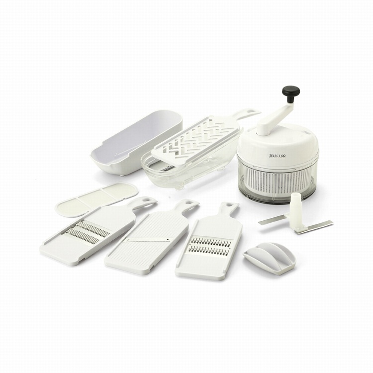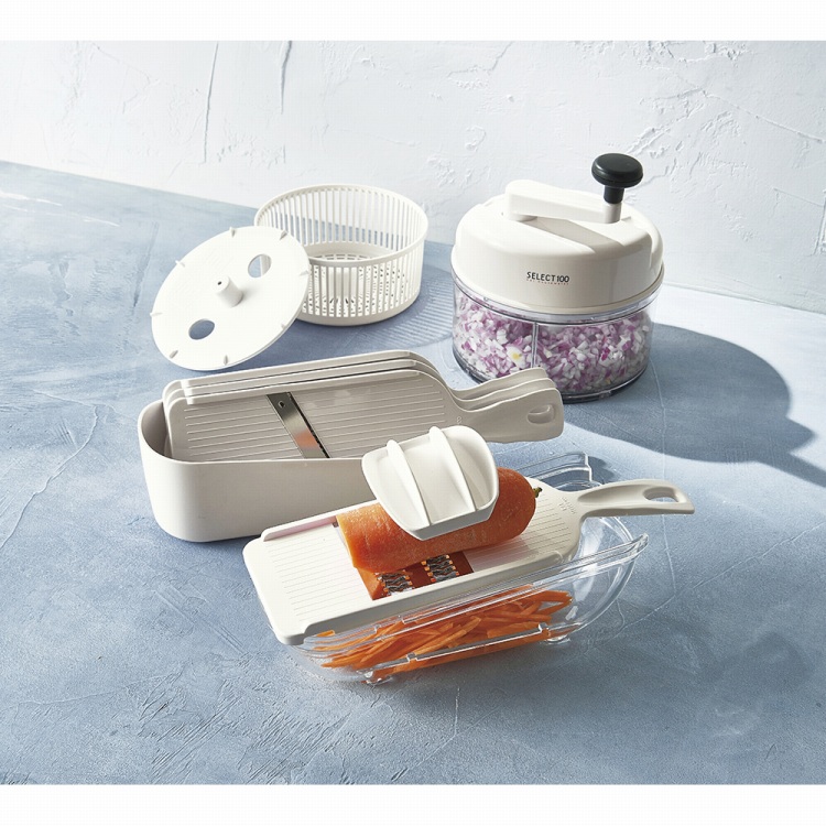 商品内容●商品:調理器セット(収納ケース/約30.5×9.5×高さ11.9cm)・指ガード・目皿各1・野菜調理器×4(スライサー・千切り・細千切り・おろし)