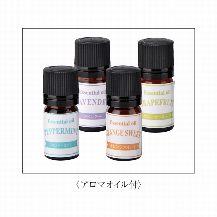 ●内容:アロマオイル5ml×4(ラベンダー・ペパーミント・グレープフルーツ・オレンジスィート)・連続使用時間約1~2時間(最大水量時)