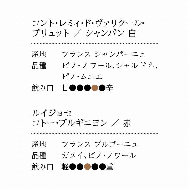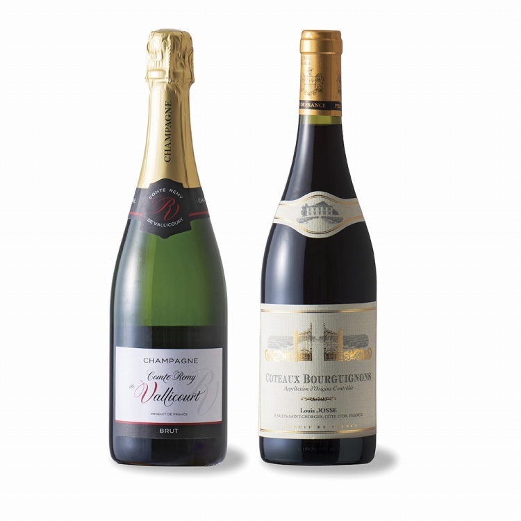 商品内容●コント・レミィ・ド・ヴァリクール・ブリュット750ml、ルイジョセ コトー・ブルギニヨン750ml、ソムリエナイフ付