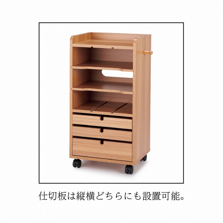 ●内容:耐荷重約10kg(天板)・約1kg(引出1段あたり)、仕切板2枚・キャスター付