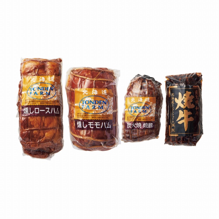 商品内容●セット内容:燻しロースハム600g・燻しモモハム600g・炭火焼焼豚200g・炭火焼焼牛250g各1