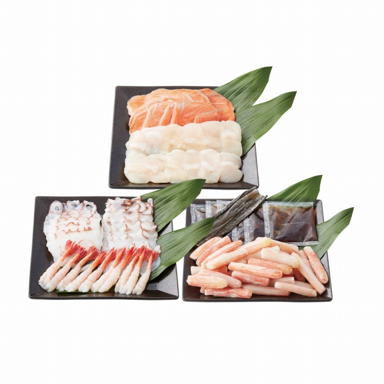 商品内容●セット内容:ズワイガニ棒ポーション300g、たこスライス200g、帆立貝柱スライス200g、トラウトサーモンスライス200g、甘えび×10、だし用昆布・たれ付