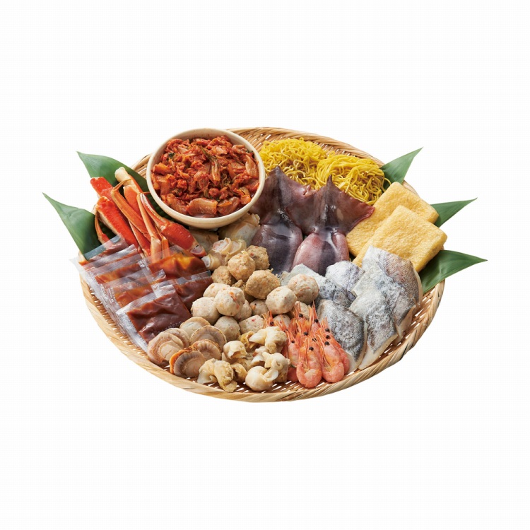 商品内容●セット内容:ボイルズワイガニカット300g×1、白菜キムチ100g×8、ボイル海老×12、ボイル帆立・助宗鱈切身40g各6、つみれ(かに入・えび入・とりごぼう各6)、ツボ抜いか100g・油揚げ・ボイルつぶ貝60g・ラーメン80g各2、たれ付
