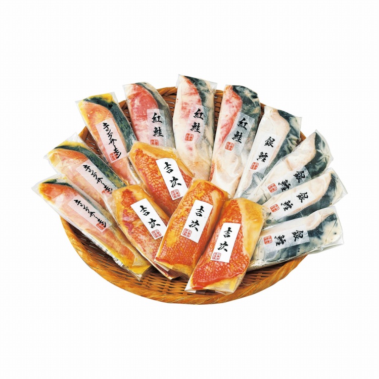商品内容●セット内容:アラスカ吉次西京漬100g・銀鱈粕漬80g各4、紅鮭粕漬80g・キングサーモン西京漬80g各3
