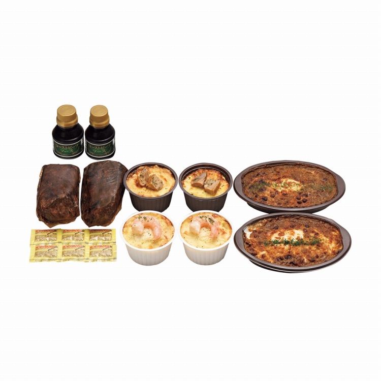 商品内容●セット内容:エビとフジッリのグラタン130g・チキンとフジッリのグラタン130g・焼きビーフカレーのドリア300g・ローストビーフ250g(モモ/オーストラリア産)各2、ローストビーフソース・西洋わさび付