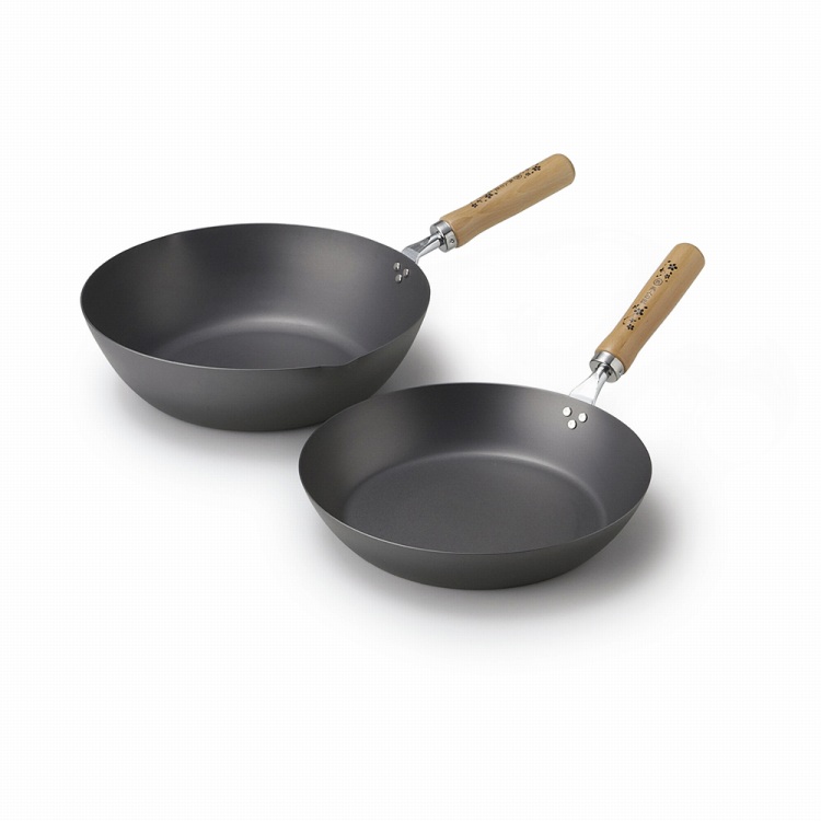 熱まわりの良い鉄製のフライパンといため鍋のセット。