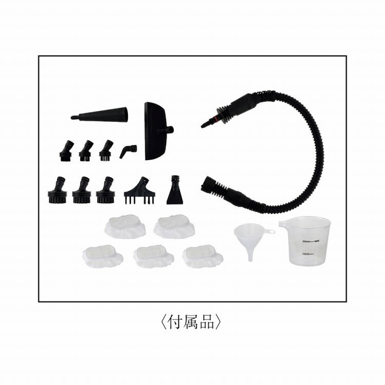 ●内容:布カバー×5・ブラシ・ブラシ大各3・ストレートノズル・延長ホース・アングルノズル・サッシ用ブラシ・リトルスクレーパー・アタッチメント・ジョウゴ・メジャーカップ各1・コードの長さ約4m・連続使用時間約11分